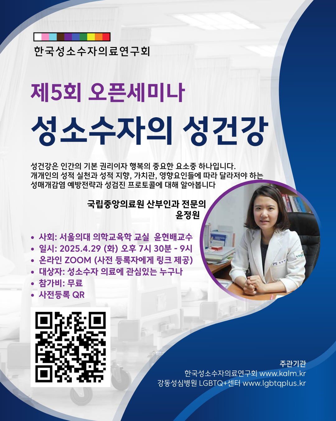 성소수자의료연구회에서 성소수자의 성겅강을 주제로 제5회 오픈세미나를 개최합니다.