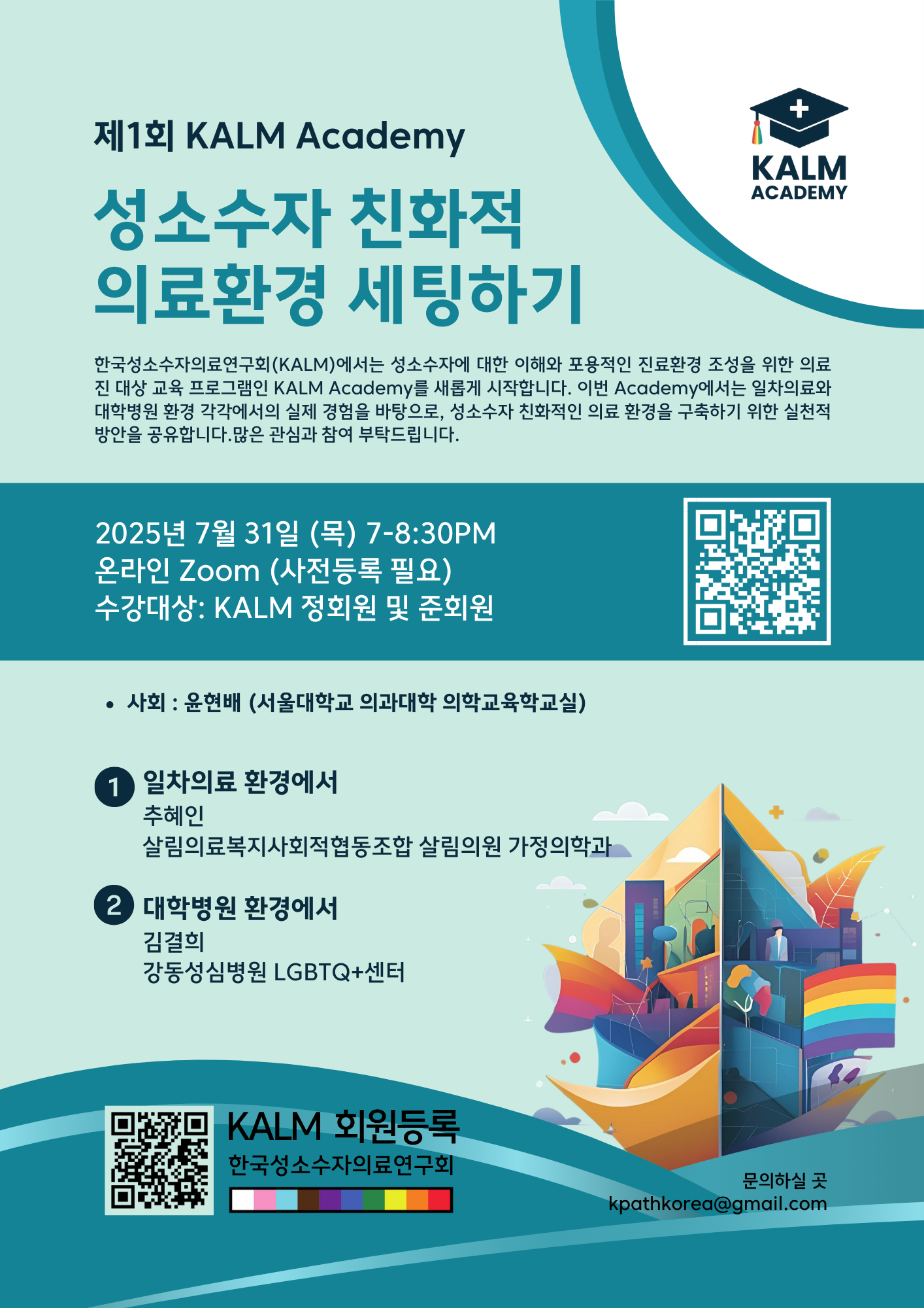 한국성소수자의료연구회(KALM)에서는 성소수자에 대한 이해와 포용적인 진료환경 조성을 위한 교육 프로그램인 KALM Academy를 새롭게 시작합니다. 그 첫 번째 주제로 아래와 같이 행사를 개최하오니, 많은 관심과 참여 부탁드립니다.